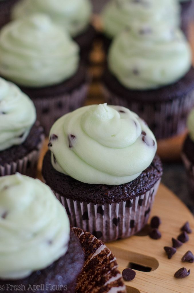 Dark chocolate chocolate chip cupcakes topped with creamy mint chocolate chip buttercream.